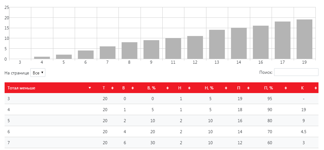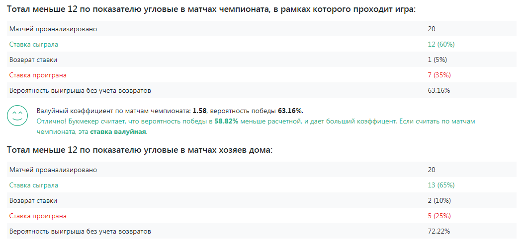 Лайв статистика. Когда матч идет, каждую минуту мы обновляем данные по нему на сайте. Это позволяет держать Вас в курсе всех важных событий на поле. Для истинных профессионалов лайва создана улучшенная версия инструмента, в реальном времени показывающая, насколько команда далека от среднего показателя с учетом того, какая часть матча уже позади. Прошло 60% матча, а набито только 25% от среднего количества угловых? Узнайте об этом первым, чтобы получить преимущество.