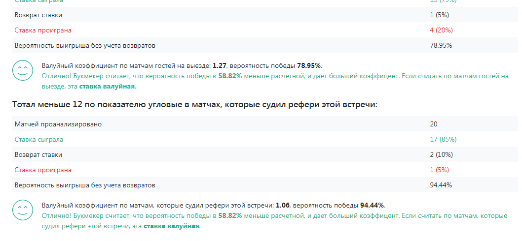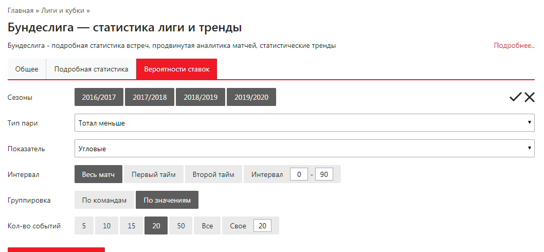 Статистические сводки по событиям, командам, лигам и рефери. Выберите любой из 19 параметров (угловые, карточки, голы и так далее), и постройте по ним детальный статистический анализ того набора событий, который Вам необходим. В рамках платной подписки доступна улучшенная версия статистики, позволяющая с первого взгляда оценить вероятность захода прогноза и узнать валйный коэффициент по нему, рассчитанный на основании статистических данных.