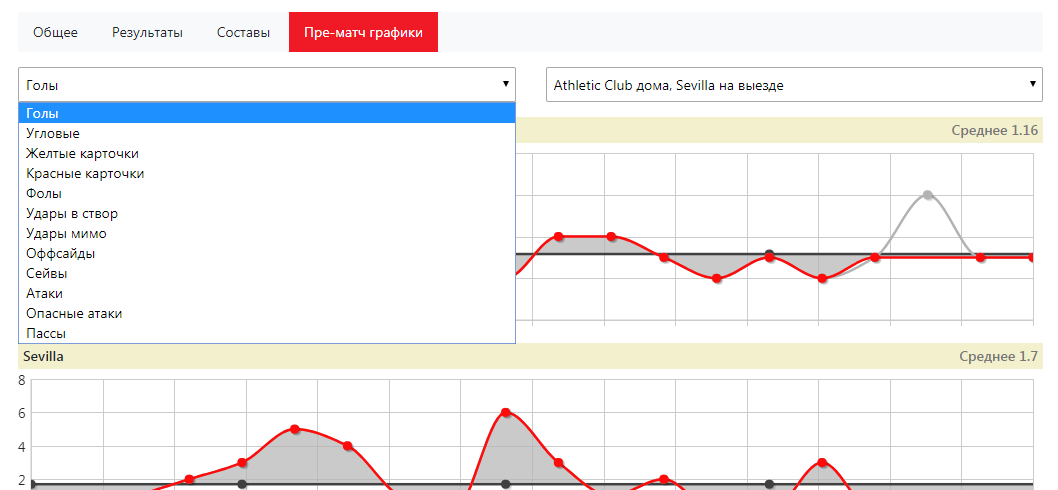 Пре-матч графики. Вы можете построить график по любому показателю, чтобы наглядно увидеть, в какой форме находится команда сейчас. На графике будет автоматически показано среднее значение по показателю, чтобы увидеть, как играет команда в последнее время и спрогнозировать ситуацию.
