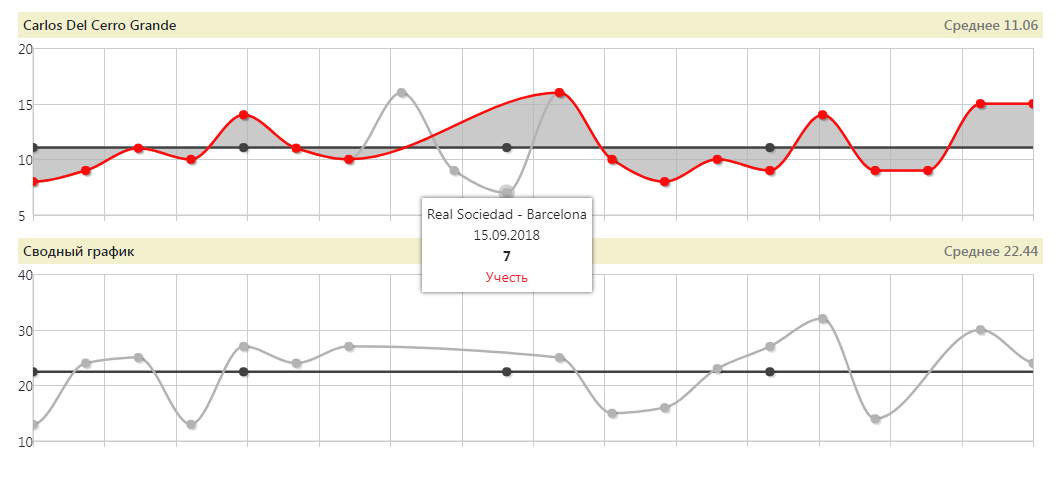 Автоматически стройте сводные графики данных двух команд и рефери. Если какой-то матч кажется Вам аномальным по показателю - просто исключите его из графика.