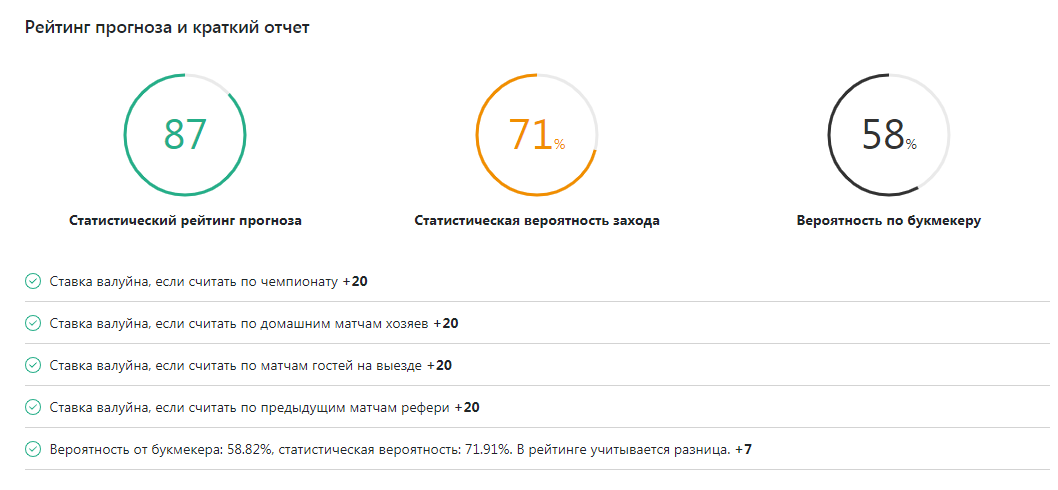 Валуйность прогноза - автоматический инструмент для получения детального статистического отчета по Вашему прогнозу на конкретный матч. В основе инструмента лежит алгоритм, разработанный нами в сотрудничестве с профессиональными прогнозистами.