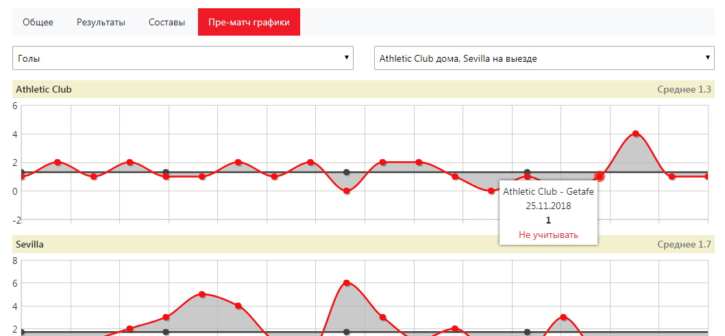 Пре-матч графики - этот инструмент поможет визуализировать форму команд и рефери по выбранному показателю в виде наглядного графика. Он не помогает напрямую сделать прогноз, но позволяет визуально оценить, находятся ли участники встречи на подъеме по выбранному показателю и максимальный тотал может быть пробит, или, наоборот, все будут играть по минимальным значениям. Инструмент наглядно иллюстрирует цикличность в показателях команд и судей.
