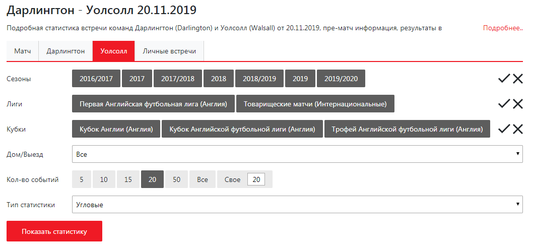 Статистика - ставший уже классическим инструмент. Укажите набор событий: можно выбрать события в рамках какой-то лиги или кубка, события, где участвовала определенная команда или которые судил определенный рефери, а так же противостояниия двух команд (Head-To-Head), затем применить к ним дополнительные фильтры и тут же получить сводную таблицу по выбранному показателю (голы, фолы, угловые и так далее). Матчи, которые Вы считаете выходящими за статистическую погрешность, можно отключить, чтобы они не участвовали в расчете средних значений.