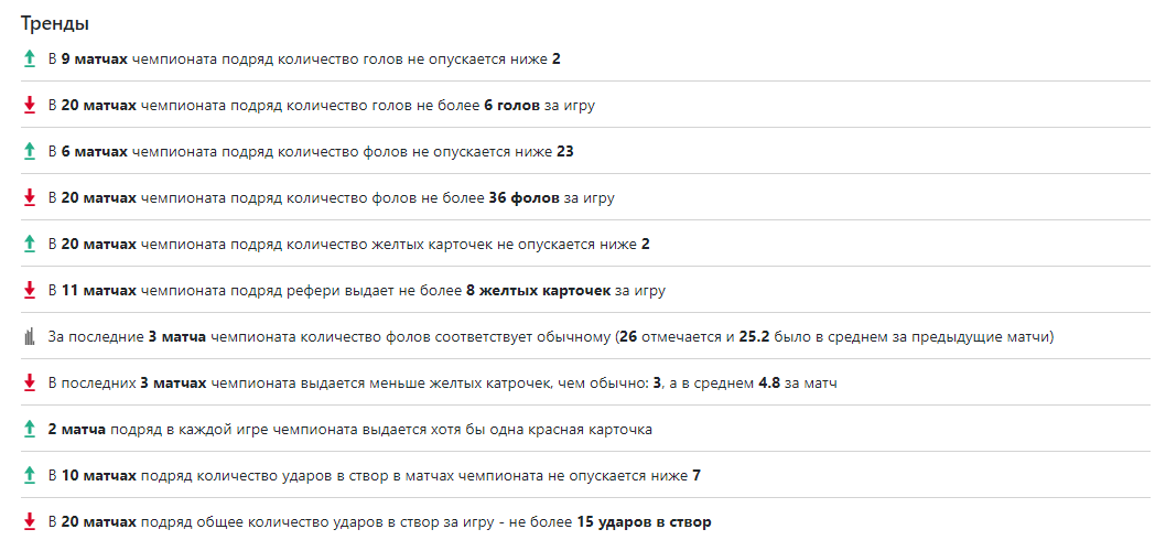 Тренды - сайт автоматически рассчитывает основные тренды для чемпионатов, команд и рефери. Тренды доступны по голам, карточкам, фолам и ударам в створ. При формировании трендов мы рассчитываем серии побед, минимальные и максимальные значения показателей в последних матчах, отклонения от средних значений показателя в последних матчах от среднего за все время, а так же ряд других метрик.